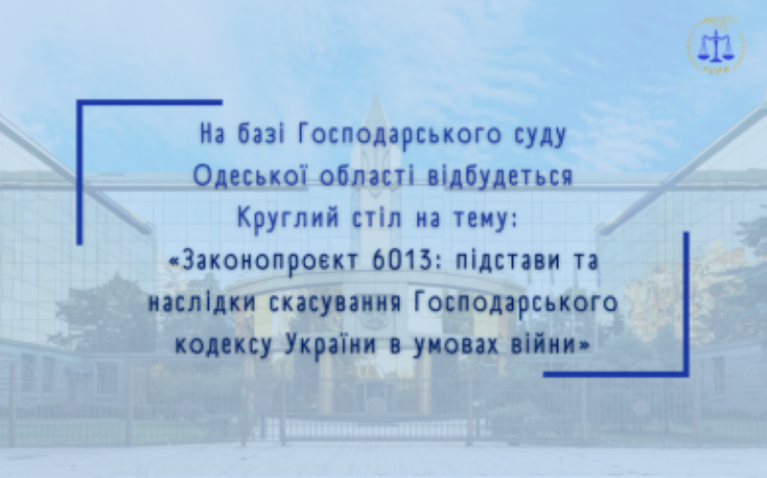 16 листопада 2022 року об 11:00 Асоціацією розвитку суддівського самоврядування України на базі Господарського суду Одеської області буде проведено круглий стіл на тему: «Законопроєкт 6013: підстави та наслідки скасування Господарського кодексу України в умовах війни» за участю суддів, провідних науковців та адвокатів.